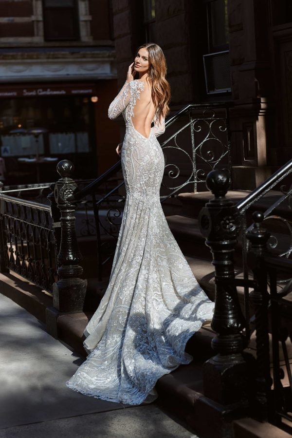 A V- neckline mermaid dress with a medium sized train and embroidery all over the top till the train looks expensive and gorgeous. The fitted dress and silhouette will be able to show the bride’s figure and look more flowing.